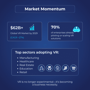 Today, virtual reality (VR) has shifted from niche technology to a mainstream driver of business transformation. VR is being utilized by industries such as healthcare, education, retail, and entertainment to train staff, develop new products, and provide more engaging customer experiences. This is due to advancements in 5G, the affordability of headsets, and immersive platforms. The momentum is backed by strong market growth. According to Fortune Business Insights, the global VR market, valued at USD 16.32 billion in 2024, is projected to reach USD 20.83 billion in 2025 and surge to USD 123.06 billion by 2032, with a CAGR of 28.9%. This makes VR a core investment priority for forward-looking companies.